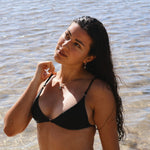 The Cayla top by Maoi Swim is a Brazilian triangle bikini top featuring golden rings, made to last for many seasons. Created to support and lift, this top has adjustable shoulder straps, and ties on the back for maximum comfort.