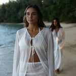 For a more minimalist, yet equally chic option, the Haupia Long Sleeve Top is the epitome of simple elegance. Designed in a soft, neutral ivory tone, this top provides timeless sophistication with a modern twist. The sheer fabric offers a light, airy feel, while the adjustable front ties allow you to shape the top to your desired fit. The Haupia Long Sleeve Top is the perfect layer to elevate any resort look. Its understated design and versatile nature make it a must-have piece for those who appreciate quiet luxury and effortless style.